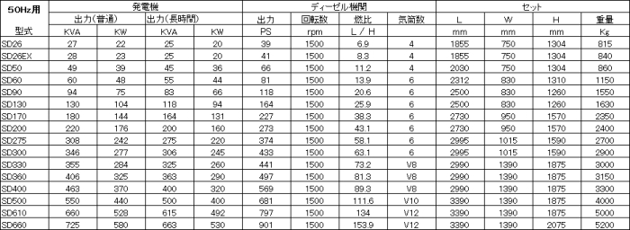 常用・非常用ディーゼル発電機型式 (Set Sales) 規格表一覧 お見積もりはこちらから ※E-Mailが起動するまで多少時間がかかります。 ※写真をクリックすると拡大されます。 |